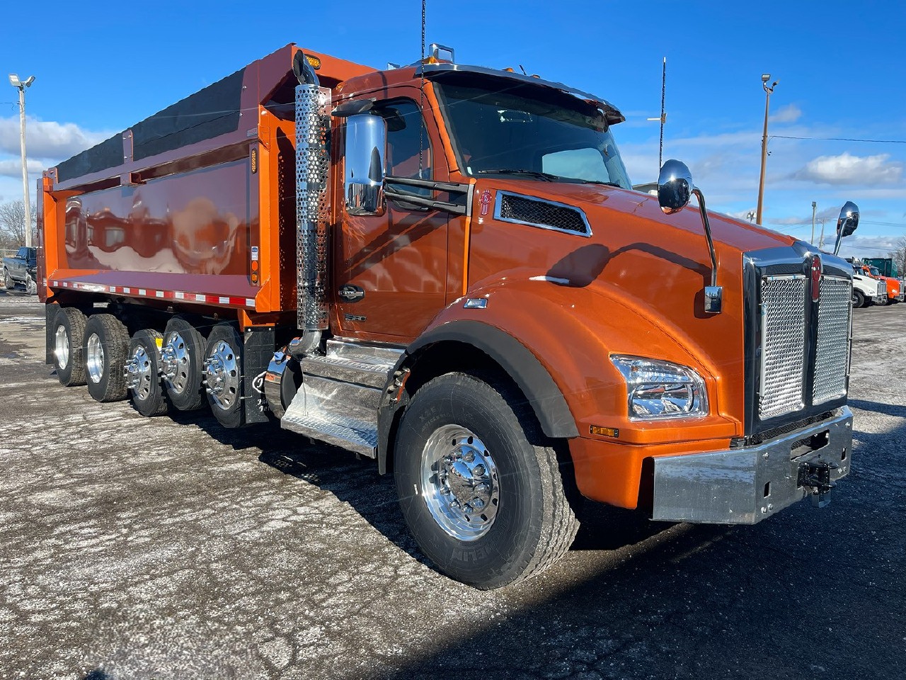 This new 2026 Kenworth T880 6-axle dump truck is built for demanding heavy-duty applications where strength, stability, and reliability are critical. Available now, this T880 is purpose-engineered for construction, aggregate hauling, and vocational work that requires consistent performance under load. Powering this truck is a PACCAR MX-13 engine rated at 510 horsepower, paired with an Allison 4500RDS automatic transmission. This proven drivetrain delivers smooth, predictable power and excellent drivability, making it well suited for stop-and-go jobsite conditions and heavy payloads. Configured with a 20,000-lb front axle, 46,000-lb rear axles, and a 4.10 rear ratio, this 6-axle dump truck is designed to handle demanding weight requirements with confidence. The Haulmaax suspension provides durability and stability, while air brakes ensure consistent stopping power in challenging work environments. A 276-inch wheelbase and 208-inch cab-to-axle create a solid foundation for dump applications, balancing payload capacity with maneuverability. This unit features a steel dump body and a 66,000-lb GVW, classifying it as a true heavy-duty vocational dump truck. Inside the cab, drivers will appreciate air conditioning, heated mirrors, and a functional workspace designed for long days on the job. Finished in a bold orange exterior with slate gray interior, this truck offers both visibility and a professional appearance. This new Kenworth T880 6-axle dump truck is ready to go to work.